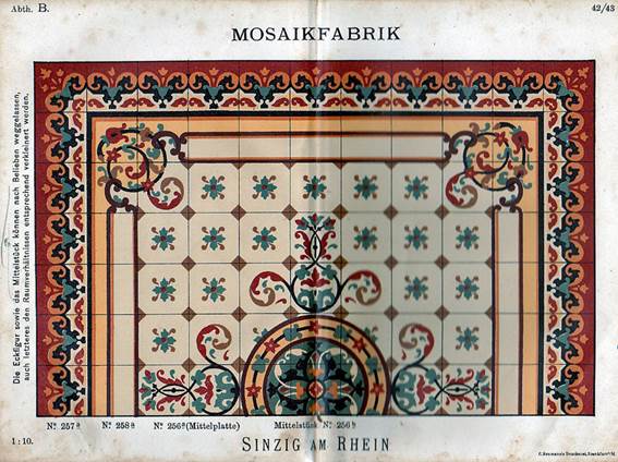 Das Mittelfeld besteht aus 4 x 4 = 16 Platten im Format von jeweils 17 x 17 cm der Nummer 760 aus dem Werkskatalog Sinzig von 1896.