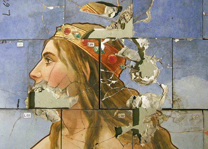 Abbildung zeigt deutlich mutwillige Zerstörungen von Fliesen.